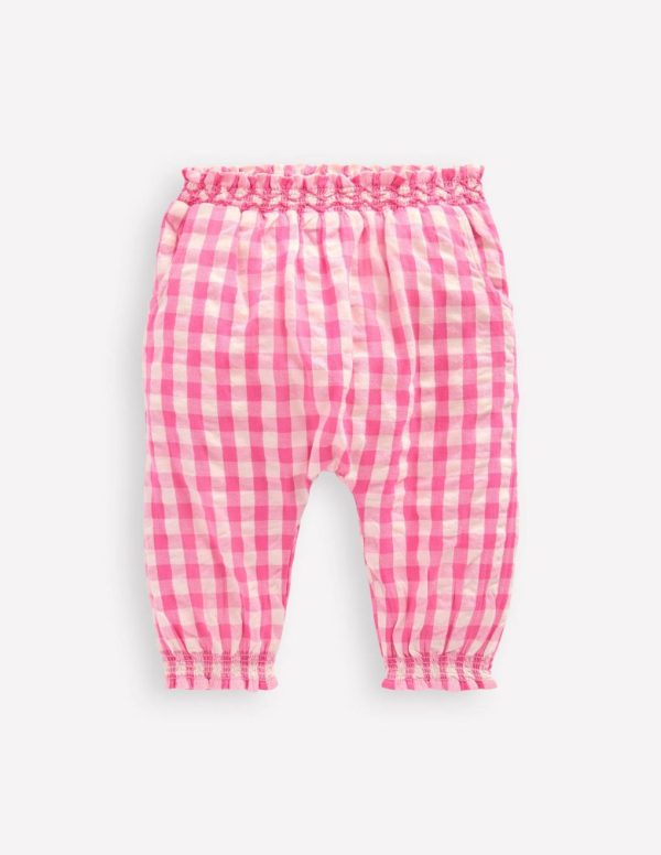 Minis will be ready to explore in these hareem-shaped cotton trousers. The waist is shirred with smocked embroidery and the cuffs are both stretchy and frilly. It even has pockets.– Base 100% cotton