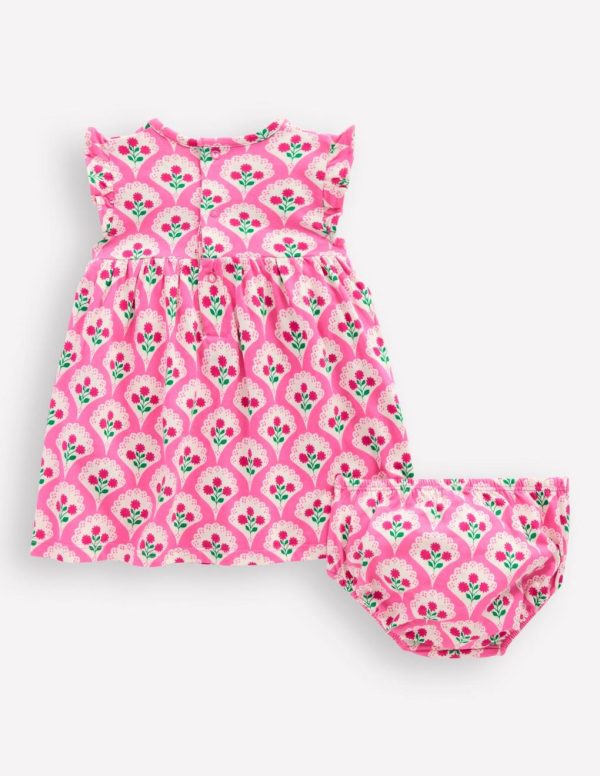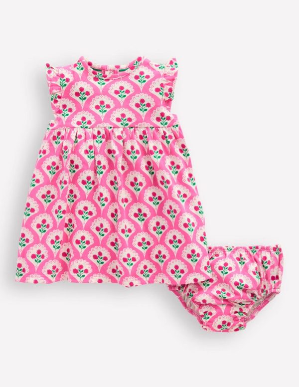 An everyday dress that brings Minis to sunny places thanks to its adorable colourful prints. And we have matching ruffly pants with elasticated waist and leg cuffs.– Bloomers on sizes up to & Including 18-24m. Age 2-3y does not include bloomers for this style.