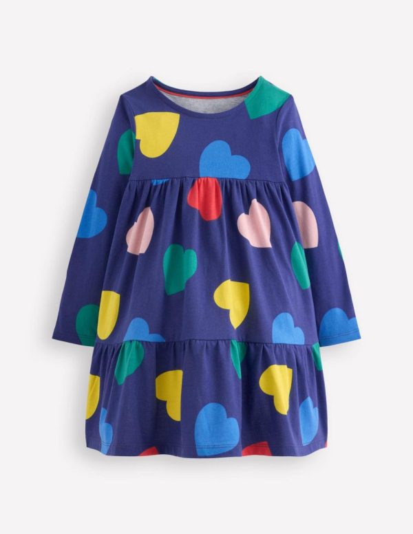 With a full tiered skirt and peplum hem, dance parties are top of the agenda in this bright and cheerful cotton-jersey dress. The long sleeves will keep Minis cosy into autumn.– Keyhole & button fastening at back neck on ages up to & icluding 4-5y