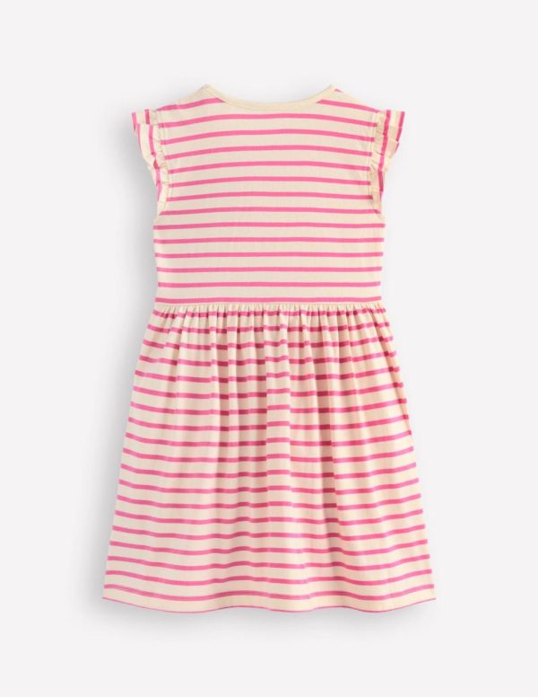 This dress will have sun-loving Minis fizzing with excitement. It’s 100% cotton with flutter sleeves and the appliqué designs make it into a living, moving picture book of sweet things.– Designed to fall above the knee
