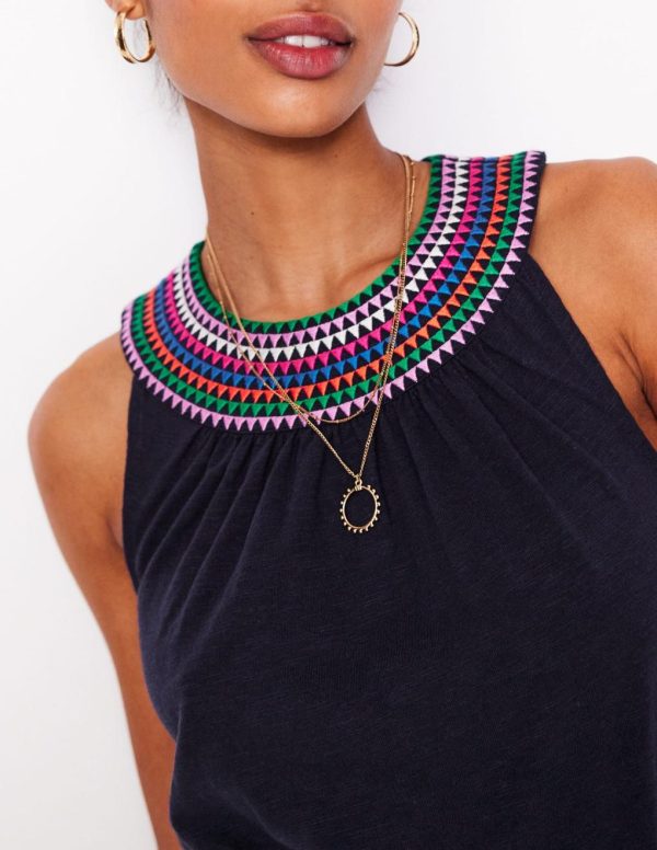 The colourful embroidered neckline of this knee-grazing dress will create the brightest of smiles this summer. The T-shirt shape, tie belt and flutter sleeves will flex your face muscles even more.– Model is 5’9 wearing a size 2R