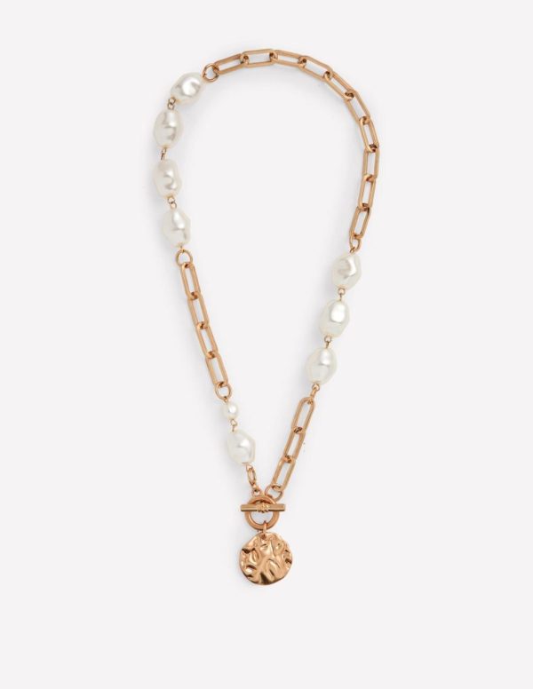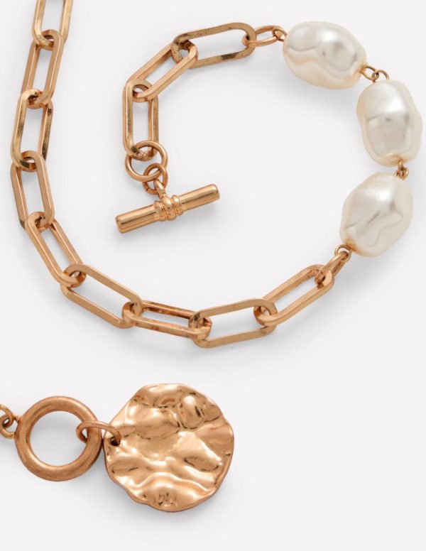 The perfect balance of summer and sophistication, this necklace combines two classic styles: a T-bar chain in gold-tone metal with faux pearls links. The weathered pendant tops it off.– Model is 5’9 wearing a size O/S