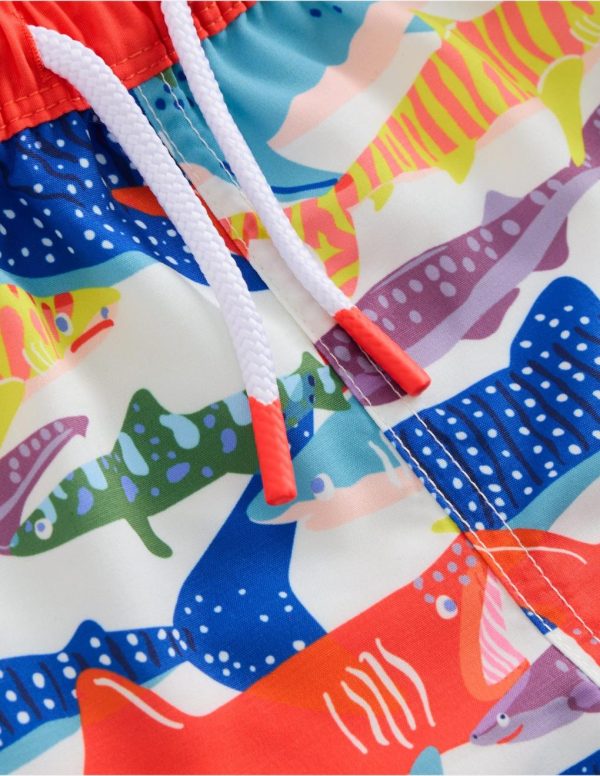 Our printed swim shorts are just the thing for Olympians-in-training. Fully lined, the outer shell is made from 100% recycled fabric. The drawstring waist will keep them in place on water slides and doing dives.– Main 100% recycled polyester, Lining 91% polyester 9% elastane