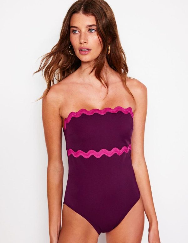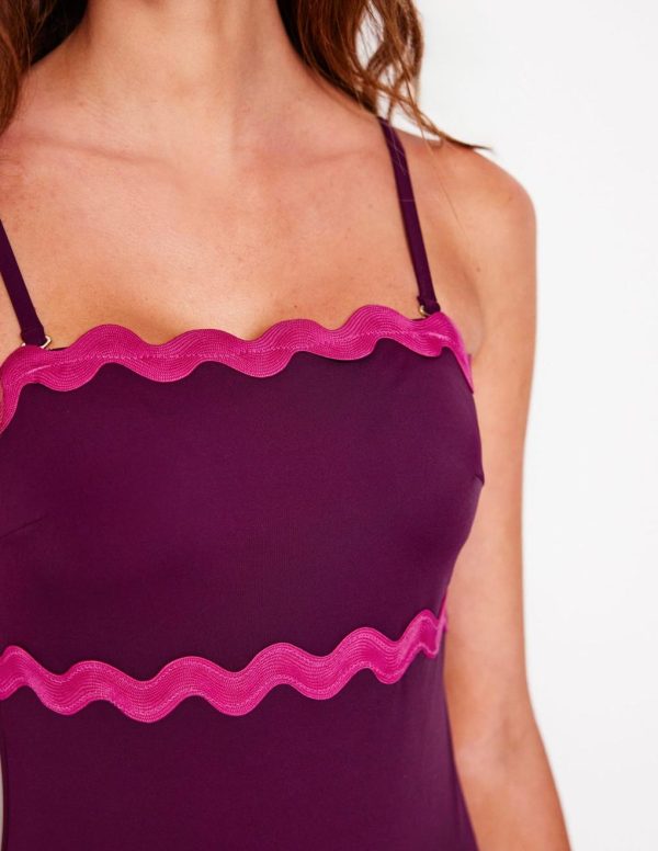 A vintage feel and plenty of modern touches: giant rik rak detail, a classic bandeau front (with easy-to-remove straps) and gorgeous cut out back. Plus, its lined with fixed hidden cups. A real holiday keeper.– Model is 5’9 wearing a size 2R