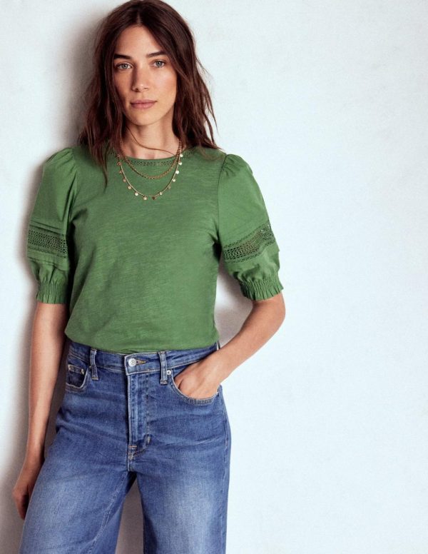 The romantic lace trim on the cotton puff sleeves and the soft jersey body creates a top that’s flattering and easy to dress up or down to suit your mood and invites.– Model is 5’9 wearing a size 4