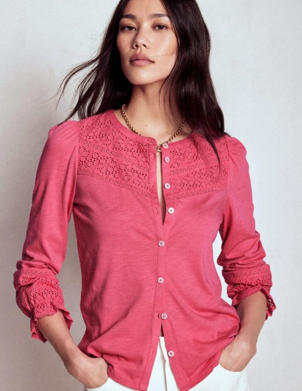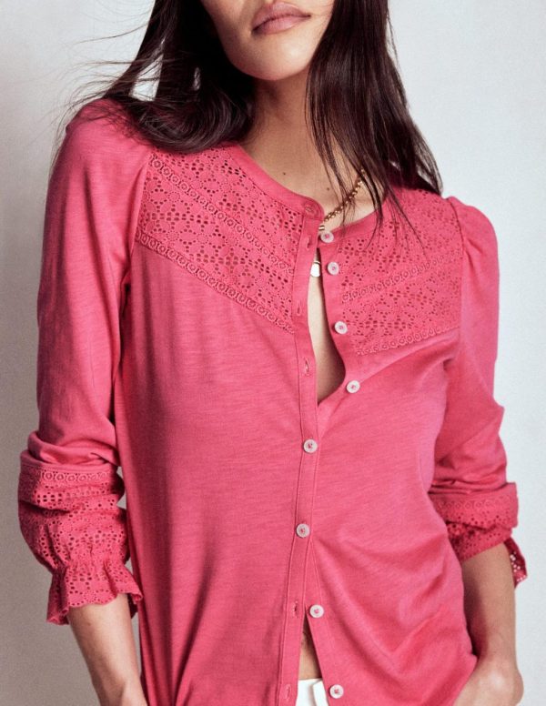 A lightweight cotton jersey top full of feminine touches from broderie detail to blouson sleeves and frilled cuffs. Move through your day with ease collecting compliments as you go.– Model is 5’9 wearing a size 2