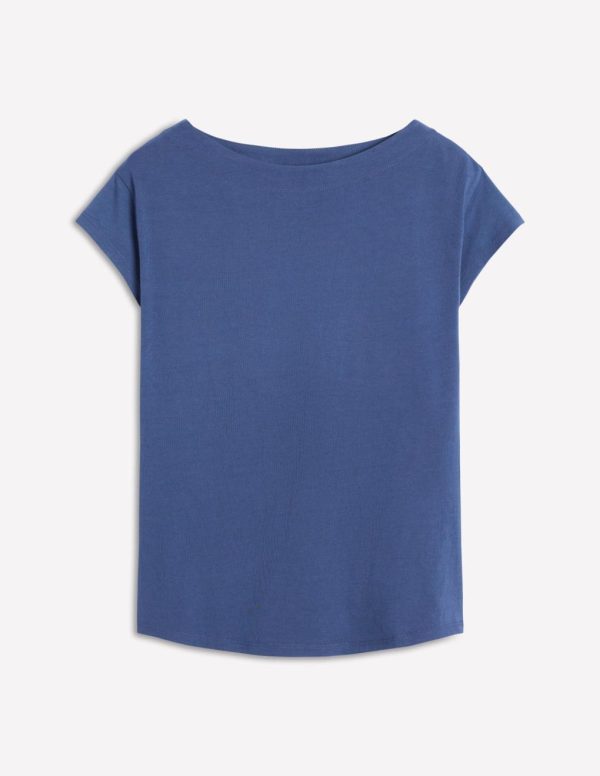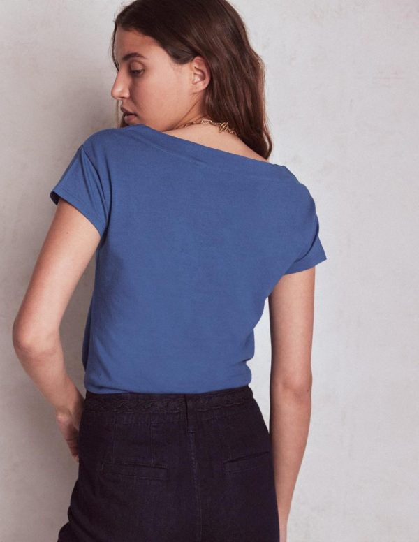 Playing with silhouette brings renewed interest to everyday basics. This soft cotton-modal blend tee is cut for a slim fit with a flattering boat neck. Wear it with jeans or layered under a denim jacket.– Model is 5’9 wearing a size 2