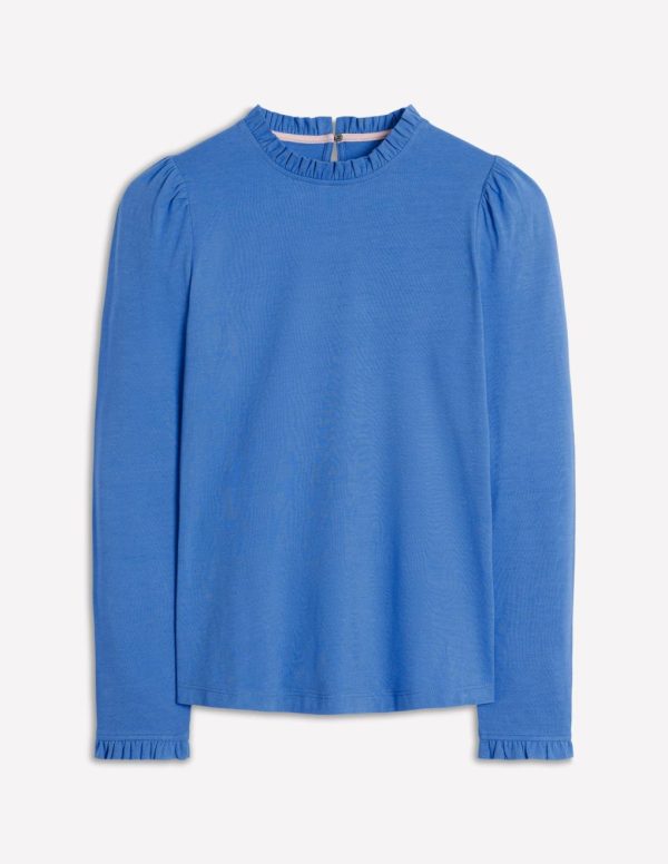 For when you’d rather be in pyjamas, but can’t really skip that presentation. Our supersoft frill detail top is a joyful kind of a compromise. It works marvelously alone or as a base layer.– Model is 5’9 wearing a size 2