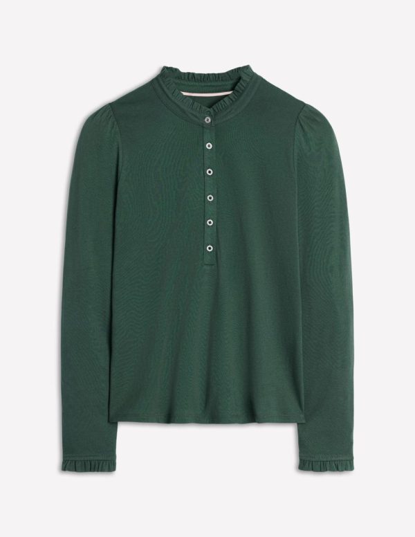 There’s nothing like frilled trims to guarantee compliments. Our buttoned up Henley top is crafted with supersoft cotton in a relaxed fit.– Model is 5’9 wearing a size 2